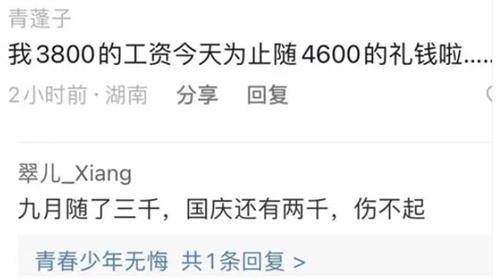 其實關于年輕人不堪隨禮的重壓早在網(wǎng)上有過多條報道,早在9月份濟南市的李女士就在網(wǎng)上吐槽自己的工資只有5000多塊錢,但在國慶假期期間光份子錢就要花費將近3000塊錢,李女士的視頻發(fā)出之后也引發(fā)了網(wǎng)友的共鳴。有些網(wǎng)友就表示我每個月的工資只有3800,有一個月光隨禮就隨了4600的份子錢真心傷不起。也有網(wǎng)友調侃到建議發(fā)工資的時候直接發(fā)到即將隨份子錢的那些人手上。