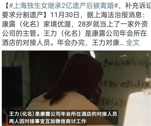 媒體將該案件曝光之后11月30號晚上話題詞#上海獨生女繼承2億遺產(chǎn)后被離婚#一度沖上了微博熱搜第一的位置引發(fā)了網(wǎng)友的熱議。據(jù)悉康露是上海人家境優(yōu)渥,28歲的時候就憑借自己的能力當上了一家外資公司的主管,丈夫王力是康露公司年會所在酒店的對接人員。雙方認識之后王力就開始對康露展開了瘋狂追求,半年之后康露就接受了王力的求婚,婚后的王力仍然像婚前一樣對康露體貼入微,婚后半年康露的父母在一場車禍中雙雙去世,王力協(xié)助康露處理好了岳父岳母的喪事,就在康露準備以新的面貌迎接生活時突然間接到了法院寄來的傳票。