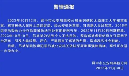10月12日,晉中市公安局高校分局透露,接到轄區內太原理工大學鄭某的報案,報案人說,自己被他人在網上造謠誹謗,經過公安機關的查明,甘肅籍人員呂某。在2018年由于非法吸收公眾存款罪被依法判處有期徒刑5年,2022年11月30日剛剛刑滿釋放,在2023年10月10日,呂某為了滿足自己的不法目的,刻意捏造鄭某的虛假信息在網絡上傳播,并且引發大量的評論轉載。對鄭某的名譽造成了嚴重的損害,同時還引起了惡劣的社會影響,目前呂某涉嫌犯罪被公安機關采取強制措施,案件細節正在進一步偵辦中。