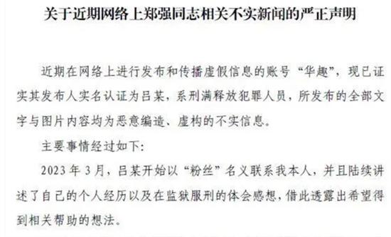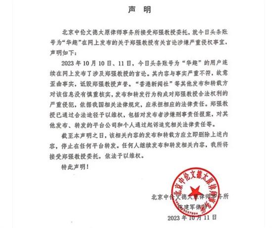 今年10月份,一位網名叫做華趣的網友在社交平臺上發文舉報,網紅教授鄭強婚內出軌包養情婦,10月12日,鄭強在個人微博公眾號中發布聲明回應此事。網名華趣是刑滿釋放人員,他所講的這些內容均為捏造,是想要故意敲詐勒索自己,目前自己已經收集相關的證據,交給有關部門處理,并且已經向當地警方報案。