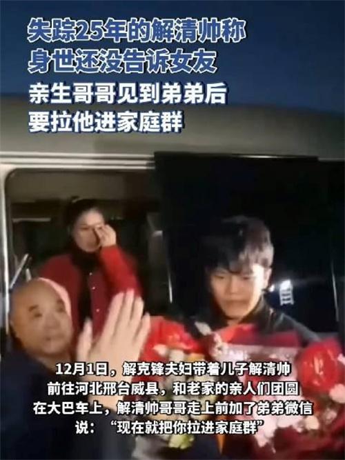 12月1日,解克峰經過警察的幫助下終于找到了自己丟失25年的二兒子解清帥,一家人在河北邢臺相認之后,解清帥喊出爸爸之后,解克峰激動的上前緊緊的和兒子抱在了一起,這一幕他們已經等了25年的時間了。在媒體對此事進行報道時,有一位為解克峰工作的職員表示,解克峰的大兒子曾經在公司說過,自己的弟弟解清帥,身高大約有1米75 150多斤。