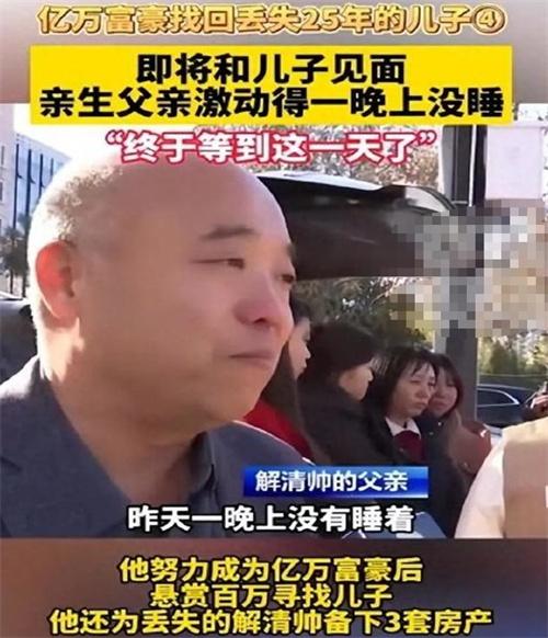近日,河北邢臺億萬富豪解克峰在時隔25年之后終于將自己被拐的兒子給找到了,父子正是相認(rèn)的場面在網(wǎng)上曝光之后,也令很多網(wǎng)友為之感覺到萬分的感動。要知道解克峰的兒子謝青帥在被偷走拐賣時才剛剛出生100天,對于一個剛剛出生尚在襁褓中的小嬰兒來講,他并不知道自己的親生父親是誰。父子相見的那一刻,隨著解清帥的一聲爸喊出之后,這個身價上億的男人也不由得激動的抱著兒子哭了起來。