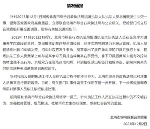 12月2日,北海市銀海區(qū)聯(lián)合調(diào)查組,針對(duì)北海市綜合行政執(zhí)法局銀灘執(zhí)法大隊(duì)執(zhí)法人員與攤販發(fā)生沖突一事發(fā)布情況通報(bào),銀海區(qū)黨委政府對(duì)此事高度重視,聯(lián)合北海市綜合行政執(zhí)法局,紀(jì)檢部門以及公安機(jī)關(guān)成立聯(lián)合調(diào)查組,對(duì)此事展開(kāi)全面的調(diào)查。經(jīng)過(guò)調(diào)查了解得知,2023年11月20日21時(shí)左右,北海市綜合行政執(zhí)法局銀灘執(zhí)法大隊(duì)執(zhí)法人員,在當(dāng)?shù)亟鸷0洞蟮揽叼B(yǎng)學(xué)院路段巡邏時(shí)發(fā)現(xiàn),個(gè)人攤販胡某違規(guī)占道經(jīng)營(yíng)。經(jīng)過(guò)執(zhí)法人員的多次勸導(dǎo)后,攤販胡某仍舊是不服管理,執(zhí)法人員當(dāng)即作出暫扣胡某車輛的決定。