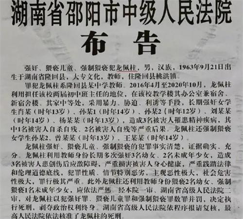 初中教師龍佩柱因長期強奸5名女學生被湖南省邵陽市中級人民法院判處死刑,并且于12月1日當天執(zhí)行。