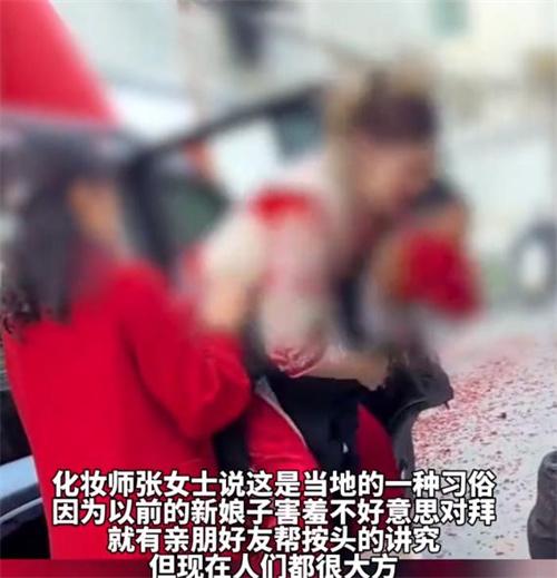 這名女子后來向大家解釋,他的這個做法是當地的一種習俗,因為之前有新娘非常的害羞不好意思,和自己的丈夫進行對拜儀式,所以會有很多的親朋好友來幫著他按頭。不過現在的人都是相對比較大方,所以也沒有出現害羞的那一個狀況,而這一名新娘被按頭之后明顯有一些不高興,但是他沒有在這么重要的場合發脾氣。對于這件事情,化妝師也表示,這種習俗非常的不好,認為按頭的話是有可能會破壞新娘子的一個妝容和發型,同時這是一個不文明的習俗。另外,有一部分網友在社交平臺上面留言稱用力按壓新娘子頭,寓意是壓你一頭。
