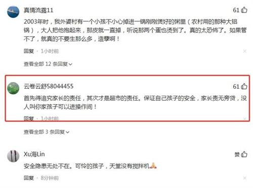 當(dāng)然我們并不是認(rèn)為超市沒(méi)有任何的責(zé)任,超市的責(zé)任在于并沒(méi)有將面包攪拌機(jī)的周圍進(jìn)行更好的封鎖,而且也沒(méi)有利益任何的安全標(biāo)識(shí)警告牌,這一點(diǎn)是屬于超市的過(guò)失,而且這一次事件發(fā)生之后,超市也應(yīng)該對(duì)安全方面進(jìn)行升級(jí)和改造,監(jiān)管部門(mén)也要對(duì)各大超市的安全防護(hù)措施進(jìn)行監(jiān)督。這件事情歸根到底肯定是怪家長(zhǎng)自己,其次才能夠怪到超市身上,因?yàn)檫@肯定是家長(zhǎng)并沒(méi)有將自己的孩子給看好,所以才會(huì)造成這起悲劇的發(fā)生。