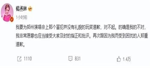 12月9日,歌手楊丞琳在鄭州開設(shè)演唱會,在演唱會中開玩笑稱河南人特別愛騙人這一句言論也引發(fā)了網(wǎng)友的熱議,12月10號楊丞琳通過微博發(fā)文致歉。在微博中楊丞琳寫道,我要為自己在鄭州演唱會上的那個冒犯并且沒有禮貌的玩笑道歉,對不起的確是我的不對,我愿意也接受大家的指正和批評。再一次跟因為我而受到困擾的人鄭重道歉。