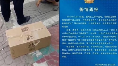 經過海南樂東縣警方的調查后發現,2023年11月28日,一對云南夫婦陳某某和楊某某生了一名女嬰,12月6日夫妻二人發現女嬰生病,于是將女嬰送到醫院進行救治,經過幾天的治療女嬰于12月12日下午夭折。很快就有網民在不經證實的情況下擅自發布的謠言視頻,說有人偷小孩藏在紙箱里,導致小孩窒息死亡,關于這些內容的謠言流傳很快,已經在網絡上造成了惡劣的影響,警方已經對造謠者進行追責。