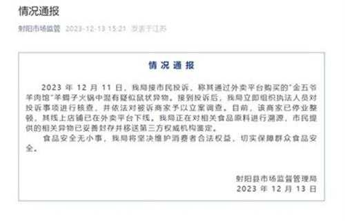 江蘇省鹽城市射陽縣市場監督管理局于12月11日接到市民投訴,稱其在火鍋外賣中疑似吃出了老鼠,經過相關部門的核查,已經對被訴商家立案調查,相關異物也送到第三方權威機構進行鑒定。在食品安全方面沒有小事,射陽縣市場監督管理局表明會維護消費者的合法權益,保障群眾的食品安全。