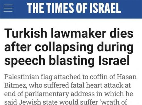 12月12日,土耳其高官哈桑比特梅茲參加當(dāng)天的議會演講時突然倒地不起,之后被送往比爾肯特市醫(yī)院進(jìn)行救治,送醫(yī)兩天后搶救無效死亡。據(jù)了解,今年53歲的比特梅茲是土耳其幸福黨副主席,從網(wǎng)傳的視頻畫面來看,這位議員在講話時用詞十分強(qiáng)硬,但當(dāng)他總結(jié)并怒斥以色列將遭受真主的憤怒時,突然昏倒在地,他的頭部似乎還撞到了大理石地板。