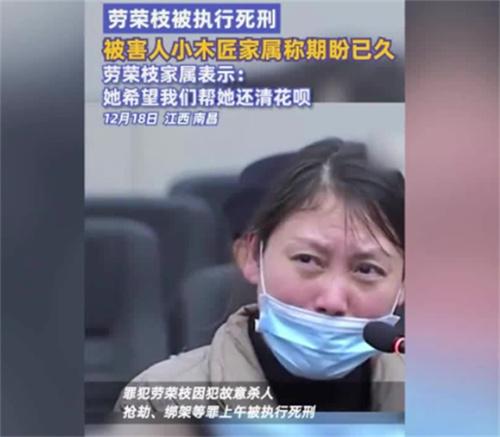 近日,最高人民法院對(duì)勞榮枝一案作出最終裁定,核準(zhǔn)勞榮枝死刑,12月18日上午,南昌市中級(jí)人民法院遵照最高人民法院下達(dá)的執(zhí)行死刑命令對(duì)勞榮枝執(zhí)行死刑,期間南昌市人民檢察院依法派專員臨場(chǎng)監(jiān)督,并在死刑執(zhí)行前安排勞榮枝會(huì)見(jiàn)了直系親屬。勞榮枝的姐姐告訴記者,最后會(huì)見(jiàn)勞榮枝的時(shí)候,還向自己要被抓前男朋友的手機(jī)號(hào),因?yàn)檫@個(gè)手機(jī)號(hào)注冊(cè)的花唄之前欠費(fèi)200元,自己一定要把這筆錢(qián)還上,并且還把密碼告訴給家人,希望家人可以幫助自己還款。