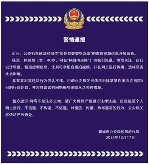 女子擺拍給住院的婆婆吃泡面視頻被公安機關依法拘留,調查后證實該女子發布虛假視頻信息,為了吸引流量博取更多網友的關注。女子拍攝的視頻里場景都是自己設計的,讓她的母親配合拍攝,在網絡傳播后造成了很惡劣的影響,公安機關對這名女子做出拘留5日的行政處罰,造謠的網絡賬號也永久封停。
