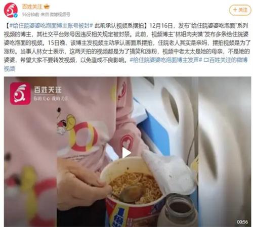 前幾日,一個名為“林姐肉夾饃”的博主在短視頻平臺發布了一條視頻信息,視頻中林某某問正在吃泡面的老人好不好吃,老人回復好吃,她說好吃的話以后頓頓吃。在這段視頻當中,林某某稱視頻中的老人是自己的婆婆,由于在坐月子的時候,婆婆曾經讓她吃了三箱方便面,并且還告訴他方便面很有營養,所以她就以其人之道還治其人之身,在婆婆生病期間也讓她吃泡面。