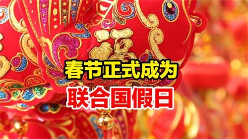 于12月22日,第78屆聯合國大會協商一致通過決議,將春節正式成為聯合國假日。由中國常駐聯合國代表團臨時代辦戴兵大使在聯大決議通過之后表示,中國傳統民俗節日春節不僅僅是闔家團圓、辭舊迎新的日子,更是傳承著和睦、和平、和諧的中華文明理念,同樣代表著家庭和睦、社會包容、人與自然和諧等全人類共同的價值,已經有很多的國家和地區將春節當做法定節假日,大約全球1/5的人口通過不同的形式慶祝春節。