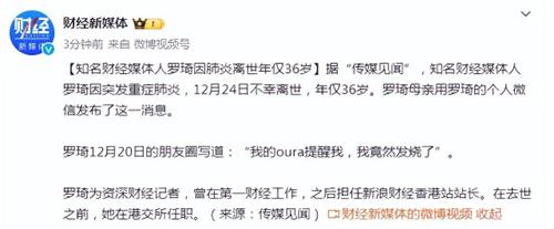 知名財(cái)經(jīng)媒體人羅琦在生前發(fā)布的最后一條微信朋友圈動態(tài)內(nèi)容中寫到,自己的oura提醒自己發(fā)燒了。沒有想到一場突然而來的肺炎,讓這個女孩丟掉了生命,在離開人世時僅僅只有36歲。羅琦因?yàn)榉窝赘邿恢紊硗龅南⑹橇_琦的母親通過羅琦微信的方式通知給朋友們的,在消息被公布以后,立刻引起了整個財(cái)經(jīng)圈內(nèi)人士的關(guān)注。深藍(lán)財(cái)經(jīng)ceo涂勁軍在微博平臺內(nèi)發(fā)文表示,這個消息對于自己來說太過于突然,在一星期之前羅琦還來到了自己的直播間內(nèi),而且當(dāng)晚玩的都非常開心。