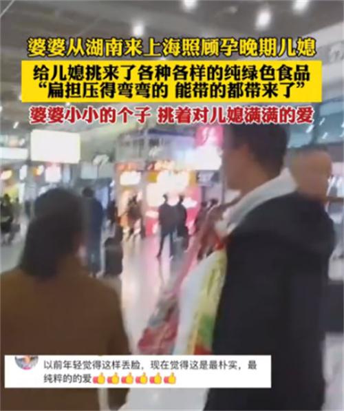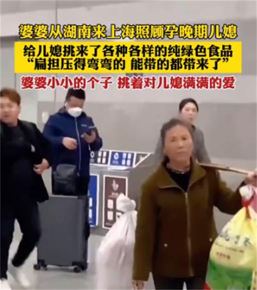 北京時間12月26日,在上海地區發生了一件十分感人的故事,一位婆婆挑扁擔的東西從湖南老家來到了上海照顧自己懷孕的兒媳婦,扁擔里面的東西全部都是婆婆從老家帶來的一些綠色產品,這一幕也是讓許多的人看到之后感到非常暖心。這位婆婆是乘坐高鐵從湖南來到了上海,自己的兒子和兒媳婦都在高鐵站接她。