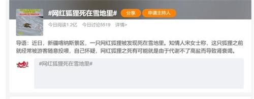 北京時間12月26日,在今天微博上出現了一個詞條引發了網友的關注,詞條當中的內容寫的是網紅狐貍死在了雪地里。據了解,在新疆阿勒泰喀納斯景區有一位游客發布視頻稱網紅狐貍死亡,從視頻當中可以看得出有一只狐貍躺在雪地里面一動也不動的,周圍還有很多的腳印。當事人表示自己拍攝的地點是在布爾津的路上,這只狐貍是躺在了半山腰的位置。