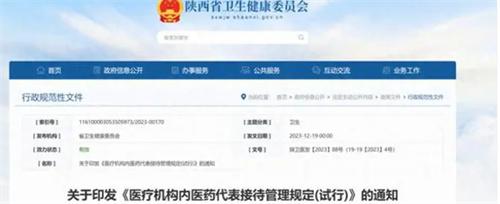 陜西省在12月19日公布《醫療機構內醫藥代表接待管理規定》從中明確醫院內醫藥代表流程規范,規定醫療機構工作人員如果擅自接待醫藥代表,由該單位約談涉及此事的工作人員以及相關科室的負責人。情節嚴重者,由單位或者上級主管部門進行處理。之前河北、江西等多個地方都陸續發布相關的文件,并且明確醫院對醫藥代表的接待規范,也就是說加大力度進行接管。
