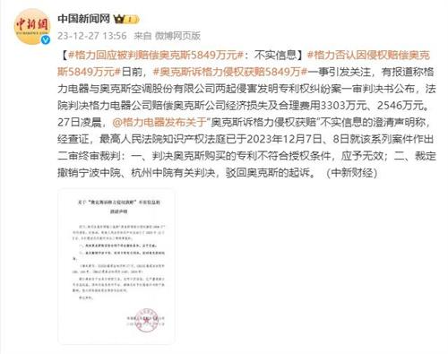 格力電器官方在12月27日凌晨發布聲明表示格力賠償奧克斯5849萬元是虛假消息,格力與奧克斯是競爭對手的關系,糾紛已久,格力電器還在2019年6月舉報奧克斯生產、銷售不合格的空調產品。格力電器在聲明中表示,公司注意到近日網絡中流傳“奧克斯起訴格力侵權獲賠5849萬”的信息,該消息屬于不實信息,并且部分媒體與平臺未盡核實義務已經侵害公司合法權益,請相關信息發布媒體和平臺及時澄清,消除不良影響。