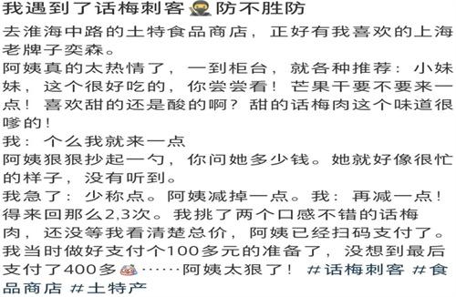 此前有網友買了兩顆話梅花了64元,網友分享自己在淮海中路土特食品商店遇到了“話梅刺客”的經歷,這位網友表示,在店鋪中正好遇到了自己很喜歡的老牌子奕森,標價是199元一斤,稱了半袋以為是100多塊錢,但沒想到,最后支付了400多塊錢。很多消費者對零食的心理預期就停留在超市中一包話梅幾塊錢的時候,沒有想象到話梅的價格能夠這么貴。