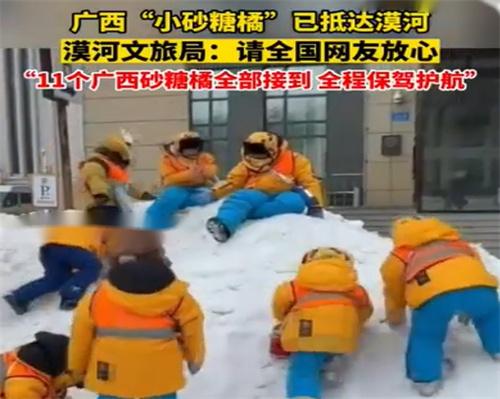 據悉廣西南寧有一家幼兒園組織了一次非常具有特色的游學活動,一共有11位年齡在3歲到5歲之間的小朋友,穿上了橘紅色的羽絨服來到了黑龍江漠河,而他們這副顯眼的裝扮在網上迅速走紅網友將他們稱之為南方的小沙糖桔。1月2號這一群南方小沙糖桔也開始踏上了來到黑龍江漠河的旅程,1月3號漠河當地文體旅游局正式宣布,請所有的網友放心11個廣西的沙糖桔已經全部接到抵達漠河,全程保駕護航保證所有沙糖桔的安全。