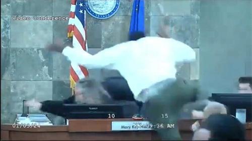 在美國當地時間的1月3日,美國媒體發送報道消息稱位于美國的內華達州的拉斯維加斯法院,在審理案件時有一名女法官當庭受到了嫌犯的攻擊。根據視頻內容顯示,在事發當時女法官正在宣布審判結果,嫌犯在聽到判決之后直接跳過桌子,一把將女法官摁在地上。