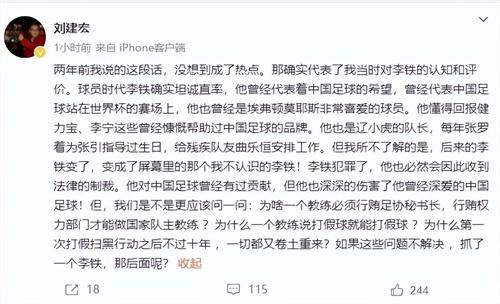 北京時間的1月,9日的晚上,隨著年度反腐大片《實力發力縱深推進》的第四季《一體推進三不腐》正式播出之后,這使前中國男子足球隊的主教練李鐵再一次成為了社會各界討論的熱點話題。在對李鐵的所作所為進行熱切討論時,這也讓很多網友不由得想到知名主持人劉建宏在兩年前曾稱贊李鐵正直,劉建宏曾經的發言,也受到了網友們的多方嘲諷。
