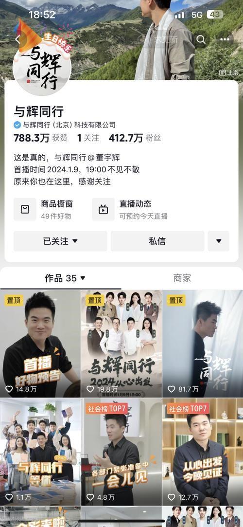 在2024年1月9日晚上7點,與輝同行的抖音賬號準時開播,根據(jù)整個數(shù)據(jù)顯示截至發(fā)稿與會同行的粉絲總數(shù)達到了736.9萬直播累計銷量超過100萬,直播累計銷售額超1億元??上攵@場直播也是掙了很多,而宇輝同行直播間的粉絲量與銷售額大漲,相比較于東方甄選的直播間增速相對較緩慢。根據(jù)數(shù)據(jù)顯示,在近10天之內(nèi)東方甄選直播間的粉絲,總量持續(xù)下滑,從2023年12月31日的3160.8萬跌至到目前的3150.1萬,伴隨著銷售額在緩慢的下滑。