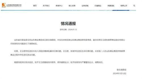 這起事件在社交平臺上發布之后已引得官方注意。山東省紀委監委會同山東黃金集團成立調查組,對反映的事實進行核實,發現王立軍確實存在違反中央八項規定精神和廉潔紀律問題,王立軍,張某存在生活紀律和作風問題,但并未發現兩人在山東黃金集團并購銀泰黃金過程中存在違規違約問題。