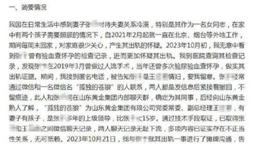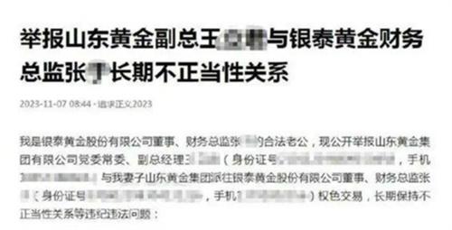 11月7日上午,一名為“追求正義2023”的網友在社交平臺上發布文章,公開舉報山東黃金集團有限公司黨委常委、副總經理王某在婚姻期間與自己妻子長期保持不正當關系。