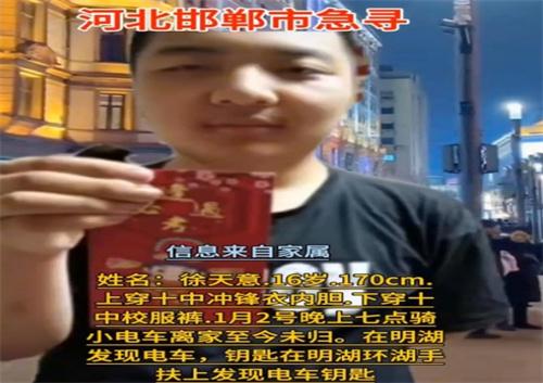 截止到目前孩子的媽媽非常擔心,失蹤的男孩名叫徐天意,在1月2日晚上7點左右騎車離家,之后與家人失去聯系,1月3日凌晨,徐天意家長和班主任楊老師聯系,希望楊老師幫忙一起尋找孩子。通過公安和救援隊的協助尋找,徐天意的電動車以及鑰匙在洺湖發現,曙光救援隊,藍天救援隊以及公安機關都在全力的尋找。家長表示不了解徐天意為什么會離家,徐天意的媽媽一直失眠,幾天也沒有吃下東西。