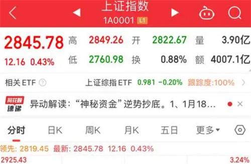 1月18日原本下跌近70點的滬指突然在下午2時左右開始拉升,滬深300ETF出現大幅放量,截至下午2時20分,成交金額達到127億,這種級別的成交額在2015年才出現過,上證50ETF也出現巨額放量,接近尾盤時成交量超過100億元,創下2015年的新高。市場分析人士稱,三大指數翻紅的原因可能是有“國家隊”進場。