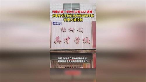 根據官方的媒體報道,在1月19日的晚上11點,河南南陽市方城縣119指揮中心接到報警之后表示英才學校的宿舍發生了火災,而救援人員就迅速地趕到現場進行救援,不過火勢迅速蔓延,最終還是有13人遇難,1人受傷,而傷者也正在醫院救治,身體特征較為穩定。事故發生之后,當地也成立了該事故的指揮部中心,迅速的展開對于該事件的詳細狀況的調查,同時對于善后處置工作,也有相關的人員進行負責,而對于相關負責的學校工作人員也已經得到了相應的控制。