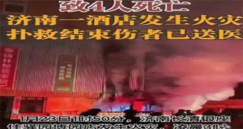長清區消防救援1月24日,濟南消防微信公眾號消息發出,山東濟南市長清區銀座佳驛長清園博園酒店在23日凌晨發生火災,大隊接警后迅速出警,消防大隊在凌晨三時許結束了現場的撲救,眾多受傷人員中有四人經搶救無效死亡。目前火災原因還在調查中,這是近期發生的又一起嚴重的火災事故,前幾天河南省的一所學校也發生了嚴重的火災,學校的火災造成了一定的傷亡,頻發的火災給人們的生命財產和安全敲響了警鐘。