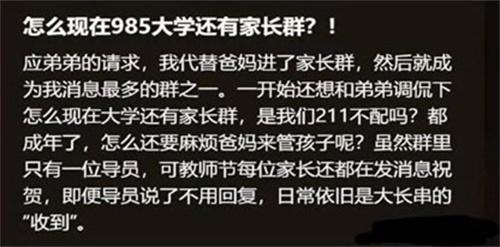 學生們面對這一消息,只能被迫接受,邀請自己的家長進入班級群,家長也是欣然同意,表示對于兒女的教育可以在大學階段加以實施。對于家長而言,這可以方便他們了解孩子在學校做什么,有什么學習任務,有什么需要父母幫助?很多學生認為自己辛辛苦苦考上大學,是為了要躲避父母的監管,沒想到,到了大學還要再次被迫接受父母的監管,實屬無奈。