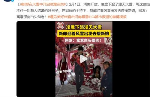 2月1日,河南開封突然下起漫天大雪,在此時新郎冒著風雪出發去接新娘。本來大雪天氣婚禮可能推遲,但這名新郎卻反其道而行之,上演中國式浪漫,迎親和送親的動物混在一起,整體很浩大兩位新人在后面緊緊跟隨,一眼望去,雪白的天地間熙熙攘攘,格外熱鬧。