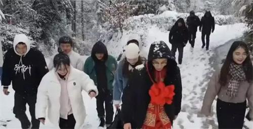 這場大雪也讓婚禮極其難忘,實際上新郎本身打算用婚車接送,但不料天氣突然下起大雪。新郎在出發之前有很復雜的步驟:新人在出發前首先要沐浴更衣,穿著整齊的服飾,佩戴合適的配飾。新郎身著中國傳統服飾胸前佩戴胸花表示隆重和喜悅的心情,步行出發前去接新娘的過程中,迎親和送親的隊伍相遇,整體美景美不勝收。