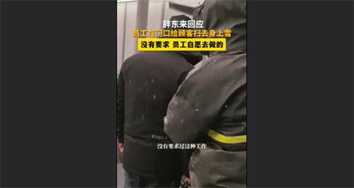 工作人員表示胖東來之所以開設掃雪服務,就是為了害怕顧客進入超市之后融化的積雪,會打濕顧客的衣服,擔心給顧客帶來不便,因此超市會提前在顧客身上積雪,還沒融化的時候提前給顧客清理干凈。