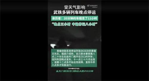 對此情況,武漢鐵路的官方稱是受到了低溫雨雪冰凍天氣的影響,導(dǎo)致漢宜線漢川至大福段發(fā)生供電網(wǎng)停電的故障,影響包括D630次在內(nèi)的多趟列車的晚點,面對雨雪天氣,人們的力量也是很弱小的,只有等待,記者也觀察到有多名網(wǎng)友在深夜發(fā)文表示D630次列車半路停運被困在車上,同時有些網(wǎng)友還稱列車上的人冷的受不了。