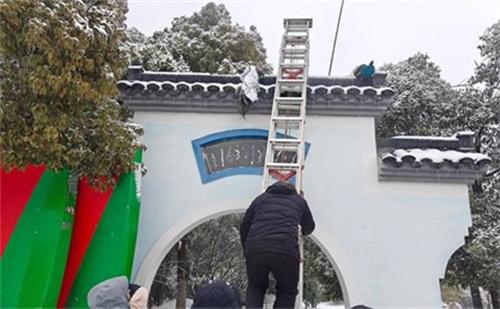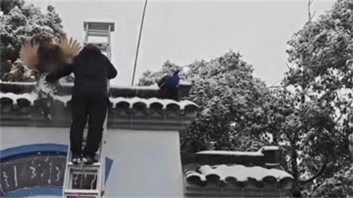 2月4日,武漢遇見了罕見的雨雪天氣,一位正在武漢園博園工作的人員,在除雪的時候發現了兩只孔雀尾羽與墻頂瓦片凍在了一起,甚至被困在了圍墻頂上,無法動彈,工作人員見到此情況,立即將兩只孔雀成功救下。