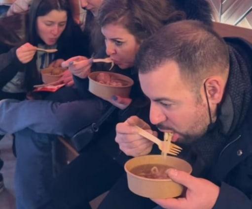 配置刀削面的還有三種不同的鹵,分別是西紅柿雞蛋,豬肉臊子和紅燒牛腩,支起攤子之后,整個香味彌漫在巴黎的集市里,無論國家無論年齡,甚至無論膚色在集市中的顧客,都被這個香味所吸引,紛紛在巴黎的街頭小攤前坐下,品嘗這道來自中國的傳統面食,并且接連對這個味道表示贊賞。