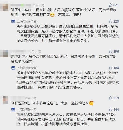 公眾號也在評論區提醒大家,來滬或者返滬的人員,在抵達上海之前應該通過隨申辦的人員服務程序填寫好相關的個人信息,并且在到達上海的時候配合相關落地檢查,在到達上海24小時內,在就近地區進行核酸檢測,如果到達上海且48小時內未進行核酸檢測的人員,在其隨申碼中會進行展示和顯示。