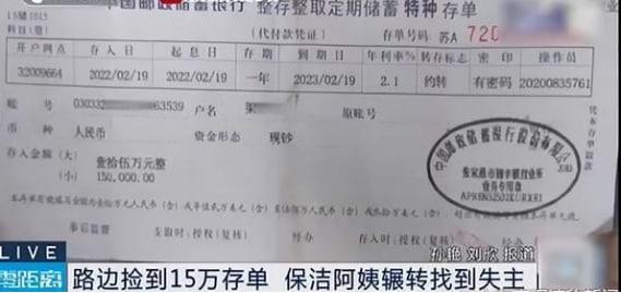 10月19日網(wǎng)絡上一條保潔阿姨減到15萬元的存單,經(jīng)過多方尋找找到失主的話題引起了廣大網(wǎng)友的注意,迅速登上熱搜。根據(jù)話題內提供的視頻,大家可以看出故事的主人公是陳阿姨,是張家港一家物業(yè)公司的保潔員。某一天晚上,張阿姨在其所在的轄區(qū)打掃衛(wèi)生時,在路邊看到一張紙,把紙撿起來一看,是一張定期的存單,而且上面寫的金額是15萬。陳阿姨當時就想15萬并不是一個小數(shù)目,如果是自己丟了的話,一定非常著急。