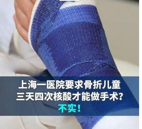 前幾天微信圈爆出一段聊天記錄,稱同事的女兒由于玩輪滑,摔斷了手臂,到醫院做手術,醫院卻要求骨折兒童在三天之內做4次核酸,只有全部陰性才會給做手術。而孩子在手臂完全斷裂的情況下,硬是扛了兩天兩夜。而且還爆料稱這件事就發生在上海兒童醫院,醫院位于萬源路上。經過多方求證,上海辟謠平臺已經發布這條信息系謠傳是不實信息。