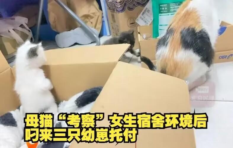 在學校當中經??梢钥吹揭恍┬游?,最近有一個大學當中的小母貓在進入到寢室之后沒有索要吃的,只是轉了一圈,接下來的事情更讓大家十分吃驚,他帶著自己的三個孩子來到了這個寢室,仿佛是要給自己的孩子找到好心人營養,這個寢室當中居住的學生也十分吃驚,表示會照顧這些小貓,但是由于寢室當中禁止飼養寵物,所以只能夠在外面飼養。