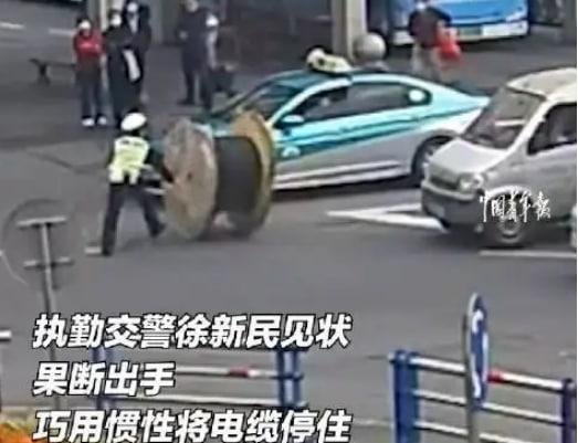 日常出門時(shí)我們會(huì)經(jīng)常在路上看到車輛出現(xiàn)一些突發(fā)的危險(xiǎn)狀況,10月25日早上7點(diǎn)左右,這個(gè)時(shí)間點(diǎn)正是每天的早高峰時(shí)期,在浙江桐廬市,就發(fā)生了一件非常危險(xiǎn)的事情,當(dāng)時(shí)桐廬市的交警輔警徐新民,正在執(zhí)行這個(gè)自己每一天的交通維持工作,就在他正在路邊指揮車輛通行的時(shí)候,這個(gè)時(shí)候在轉(zhuǎn)盤車道上出現(xiàn)了一個(gè)拉在電纜線卷筒的小貨車,當(dāng)這個(gè)小貨車從交警的身旁經(jīng)過的時(shí)候,因?yàn)槭窃谵D(zhuǎn)盤轉(zhuǎn)彎的原因,車上拉載的電纜線卷筒由于固定的波勢特別牢固,在轉(zhuǎn)彎的時(shí)候就掉落下來,并且在落到地上之后并沒有停在原地沒動(dòng),而是跟隨著慣性繼續(xù)向前方滾動(dòng),在電纜線卷筒滾動(dòng)的前方有很多的車輛,這個(gè)時(shí)候交警也是迅速的上前用自己的雙手抓住了電纜線卷筒,成功的控制住電纜性卷筒,沒有進(jìn)一步造成更大的危害。