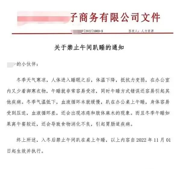 導(dǎo)讀 杭州一家公司在最近發(fā)布了一則禁止在午睡的時候趴在桌子上睡覺的通知,這個通知在網(wǎng)上發(fā)布之后引起了網(wǎng)友的爭論。