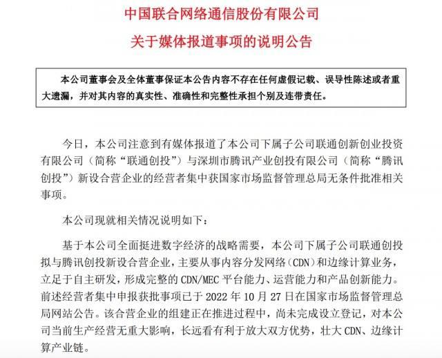 導讀 11月2日從國家市監管局的官網可以了解到,聯通投資有限公司和深圳騰訊創投有限公司,新設立的合營企業提案接受批準。