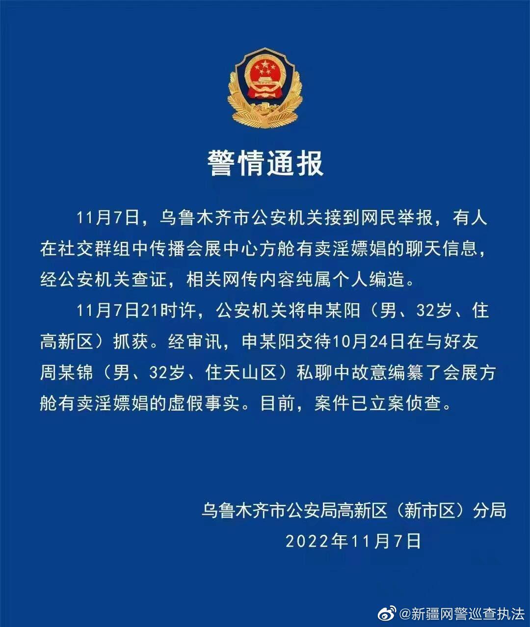 在11月7日21點的時候,公安機關已經將申某陽(男年齡是32歲,家住高新區),成功抓獲,經過公安部門人員的一番審查發現,申某陽。在10月24日的時候和好友周某錦(男,年齡是32歲,家住天山水區)兩個人在聊天的過程當中故意制造關于會展方艙有賣淫嫖娼的假聊天記錄,目前公安機關組已經正式介入,而且案件已經立案偵查。