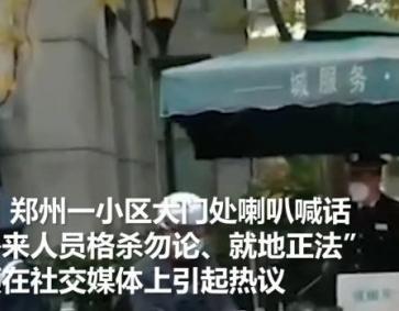 在11月20日的時候,鄭州的一個小區門崗用喇叭不斷的喊著外來人員,格殺勿論就地正法,這幾句話通過廣播正在不斷的循環播放,由于這個喊話的內容比較特殊,很快就在網上引起了網友的轉發和熱議,還有人將此事拍成的視頻發布到了網上,在視頻中可以清楚地聽到大喇叭,廣播中傳出的,本小區人員進入請出示門禁卡,外來人員進入就地正法,和外來人員進入格殺勿論的話語。